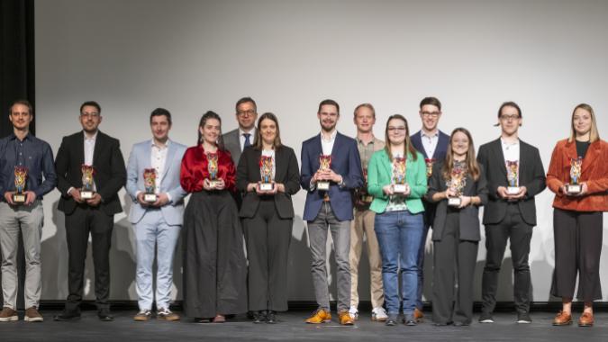 Bei der Preisverleihung am 16. Oktober in der Aula (von links): Christian Müller, Ahmad Aljohmani, Lukas Siegwardt, Kerstin Lenhof, Universitätspräsident Ludger Santen, Bianca Böhme, Marcel Weber, Tim Christmann, Lisa Schäfer, Felix Deschner, Claudia Franke, David Kaltenpoth und Selina Wrublewsky. Die Preisträger Julien König und Lukas Vierus waren online zugeschaltet. (Foto: Jörg Pütz)