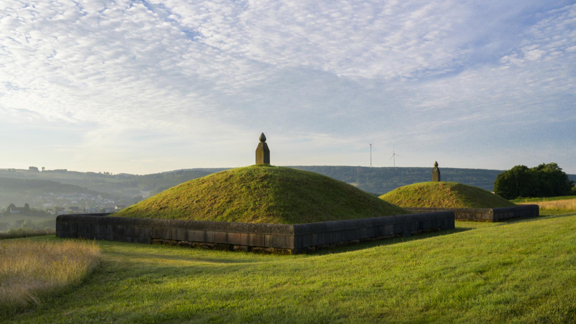 Die beiden monumentalen Erdhügel mit je einem markanten steinernen Pinienzapfen obenauf sind weithin sichtbare Zeugnisse der Vergangenheit. Nach früheren Ausgrabungen waren die Grabanlagen bereits vor 25 Jahren in Oberlöstern, einem Ortsteil der Stadt Wadern, rekonstruiert und teils mit originalen Steinen wieder erbaut worden. Die Hügelgräber stehen jedoch nicht für sich allein. Sie sind Teil einer antiken Siedlungslandschaft – und als solche erstaunlich beredte Zeugen ihrer Zeit.