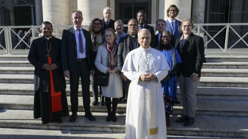 Herausgeberinnen und Herausgeber des Projekts zum Zweiten Vatikanischen Konzil und seinen Folgen für die Weltkirche trafen den Papst in Rom und überreichten ihm die bislang erschienenen Bände des Kommentars. Foto: Vatican Media