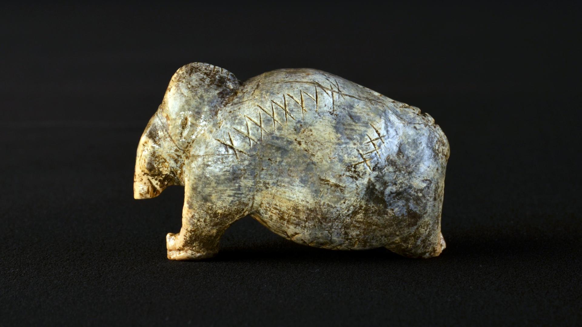 Die Mammut-Figurine aus der Vogelherd-Höhle ist etwa 40.000 Jahre alt und trägt auf ihrer Oberfläche mehrere Reihen von Kreuzen und Punkten. Foto: Universität Tübingen / Hildegard Jensen