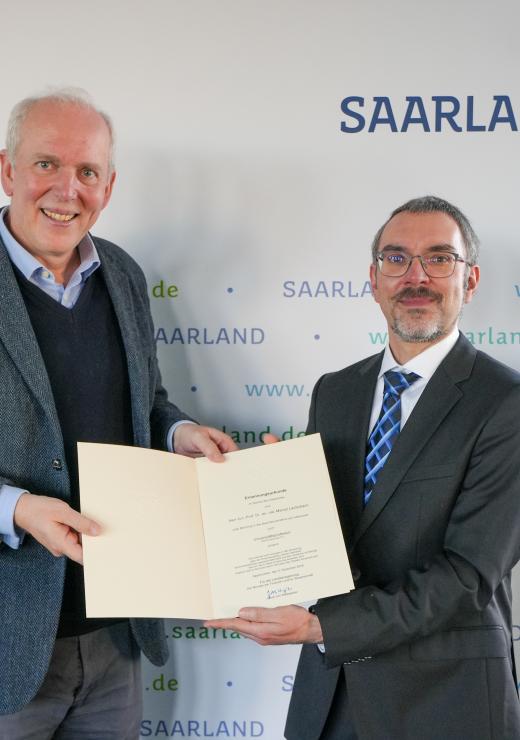 Dr. Marcel Lauterbach (r.), der bereits seit 2019 an der Universität des Saarlandes als Juniorprofessor lehrt und forscht, wird neuer Professor für Molekulare Bildgebung. Am 13. Januar 2025 erhielt er im Ministerium der Finanzen und für Wissenschaft die Ernennungsurkunde zum Universitätsprofessor von Wissenschaftsminister Jakob von Weizsäcker.