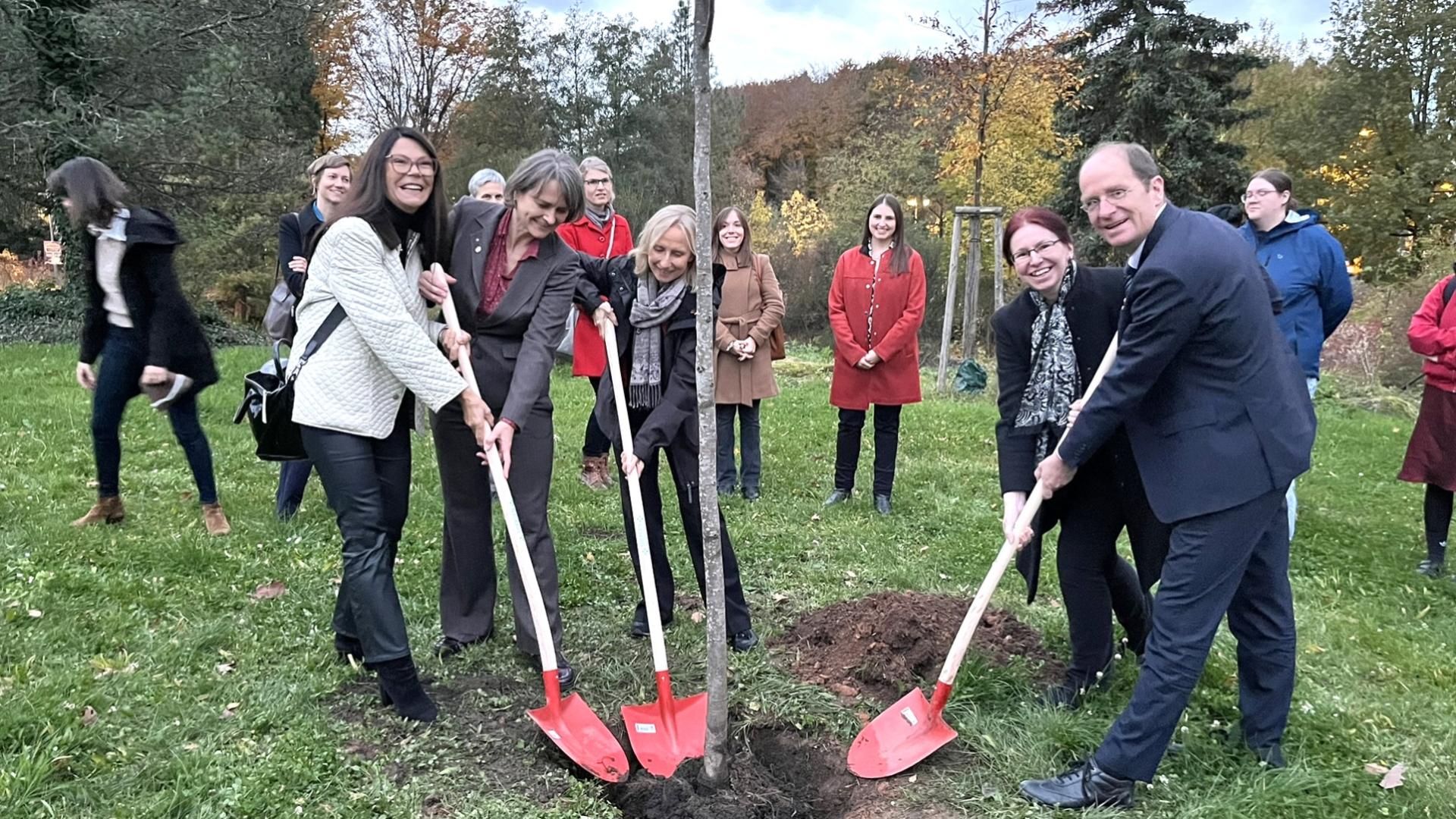 Beim Pflanzen der Winterlinde (von links): Fabienne Pierrard (Präsidentin des Clubs des Affaires Saar-Lorraine), Elke Lieb (Past-Präsidentin des Rotary Clubs), Prof. Claudia Polzin-Haumann (Leiterin der Cellule francophone en Allemagne), Prof. Romana Weiershausen (Leiterin des Frankreichzentrums) und Prof. Dominik Brodowski (Vizepräsident für Internationalisierung und Europa). Foto: Lena Mittermüller / UdS